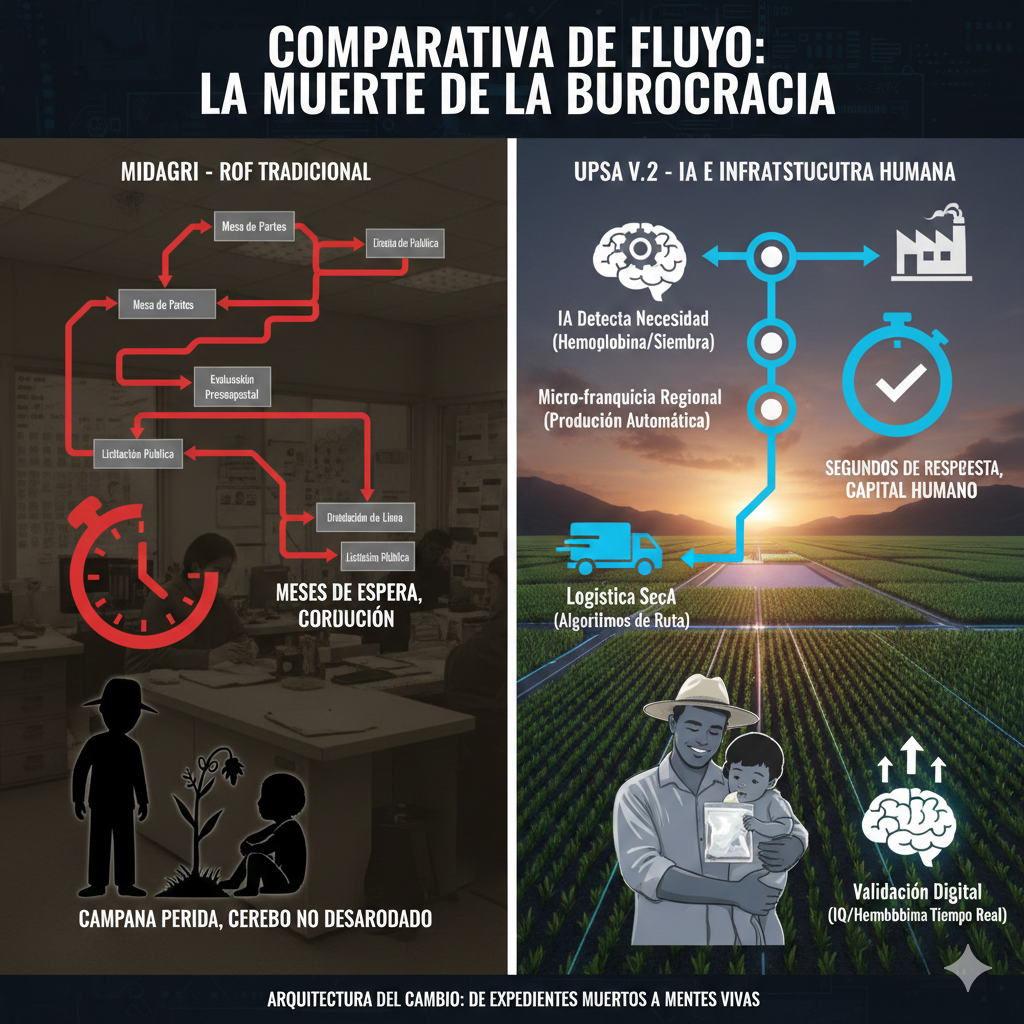 Para la sección central de tu web “NEURO-AGRO PERÚ”, este gráfico comparativo es fundamental. Visualiza cómo la UPSA V.2 tritura la inercia administrativa para priorizar la Infraestructura Humana.